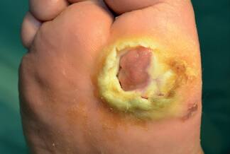 A diabetic foot ulcer is caused by infection, ulceration, or destruction of tissues of the foot associated with neuropathy and/or peripheral artery disease in the lower extremity of a person with a history of diabetes mellitus.