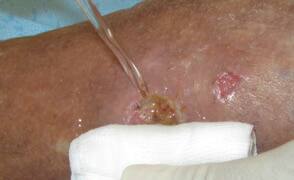- Apply therapeutic cleansing of the wound and periwound skin, using potable water, saline, surfactant, antiseptic or antimicrobial solution at every dressing change both before and after debridement.
