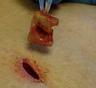 A surgical wound is a cut or incision in the skin that is usually made by a scalpel during surgery. They are usually closed with sutures or staples but are sometimes left open to heal by secondary intention.